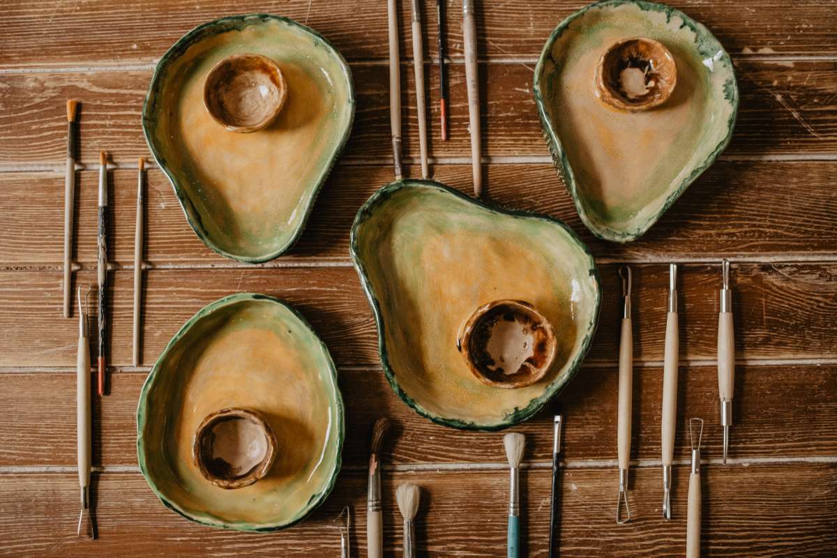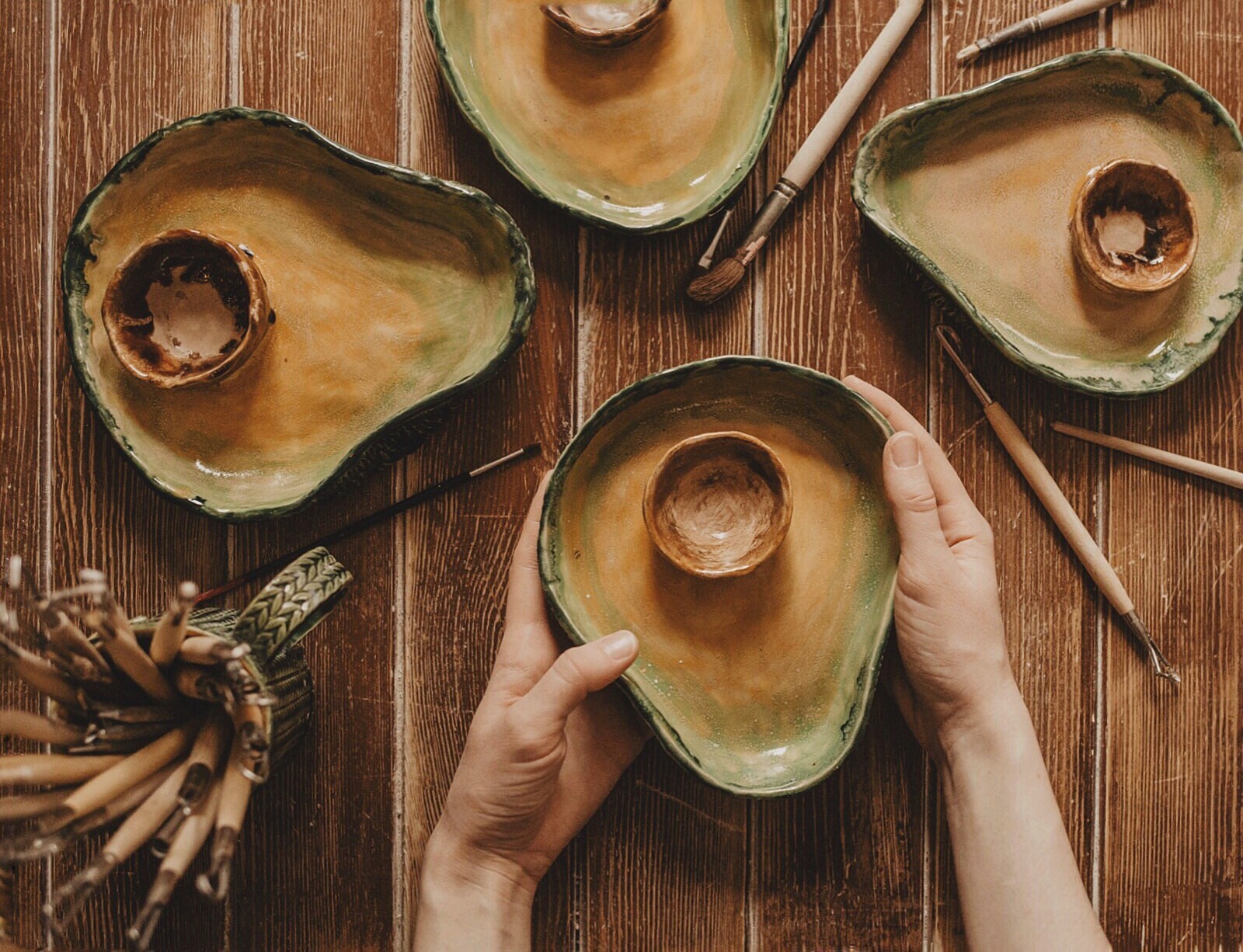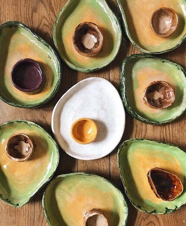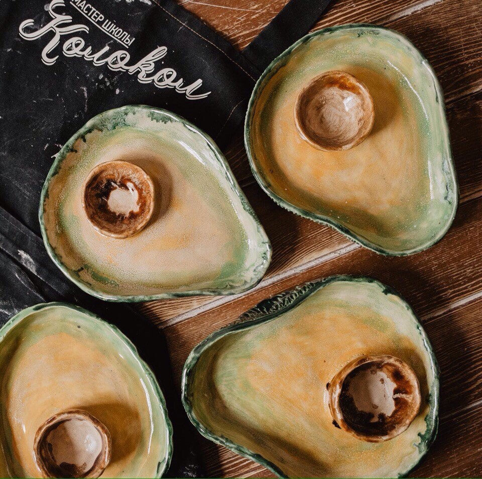 На занятии вы лепите форму, приделываете косточку-соусницу и придаете текстуру наружной поверхности. Ну а мы покрываем мисочку глазурью - несколькими цветами, чтобы было максимально "авокадисто" или любой другой на ваш выбор, и отдаём вам в течение двух недель.